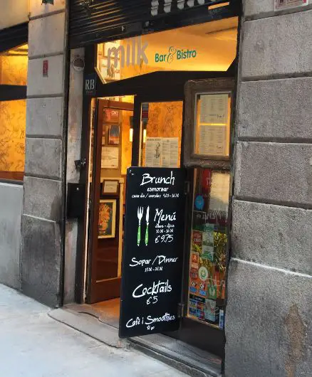 With cozy plush sofas, glittering chandeliers and 50s-style wallpaper, just popping in for a quick drink at Milk, the best brunch place in Barcelona can make you feel a little special. The venue is a stalwart of the cityâs brunch scene, with their famous Recovery Brunch, served every day from 9 am in the morning to 4:30 pm in the afternoon. You can order classics like eggs benedict, American pancakes or an English-style fried breakfast with bacon, beans, etc.