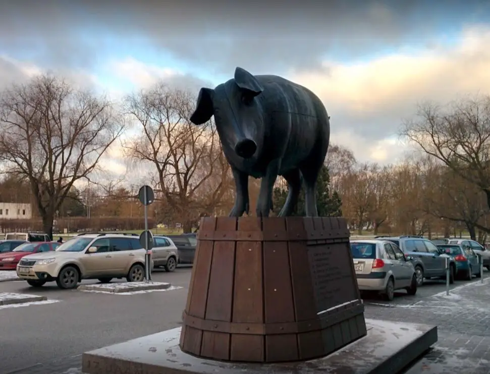Sculpture Bronze Pig is a charming reminder of several things that is aptly located near the market. First, the pig is the city’s symbol of prosperity. On a more practical level, the market sells pork hence the typical cuts of pork engraved and listed on one side of the statue. The smiling pig was brought to the square in 2008 and is meant to help new butchers with cutting meat properly. If you look this famous monument in Estonia closely, you may also find another meaning here: it smiles standing atop an overturned wooden tub–a typical basin where the animal is placed after slaughter.