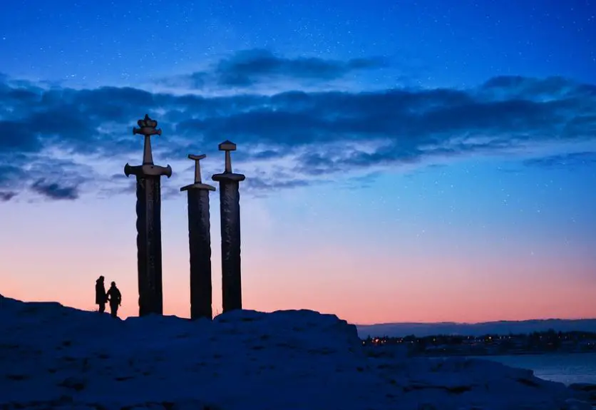 The battle of Hafrsfjord in the late 9th century is a memorable chapter in the history of Norway. At the end of this battle, the Viking king Harald Fair Hair became able to unify different Viking kingdoms into one. To commemorate this battle three big Viking swords are seen as a monument in modern Hafrsfjord or Stavanger of Norway. These were erected in 1983. The historical site in Norway is quite spectacular and one of the major Viking attractions.