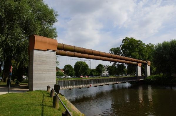 In 2002 Swiss engineer JĂŒrg Conzett opened up the city ramparts with this ingenious design spanning the Coupure. Two steel pipes are supported by four solid walls and the roadway is attached to the pipes with cables. It counted in one of the popular monuments in Bruges. When the pipes rotate on their axis, the roadway is raised. Brilliant in its simplicity and perfectly integrated with the surroundings