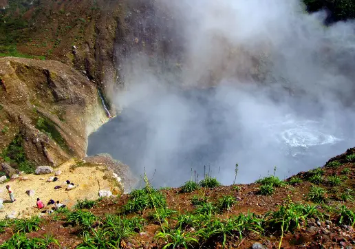 Boiling Lake is one of the most popular attractions and one of the natural monuments in Dominica. This eerie-looking pool of bubbling, three-hour hike through thick forest, gray-green water lies at the end of a strenuous. But itâs worth visiting. The worldâs second largest, Geologists believe the 63-meter-wide actively boiling lake and it is a flooded fumarole, a crack in the earth allowing hot gases to vent from the molten lava below. At the edge of the lake ranges from 82-92°C, the temperature and is at boiling point in the center. After rain, it becomes muddy and the trail becomes slick . Guides are highly recommended to visit it in the rainy season.