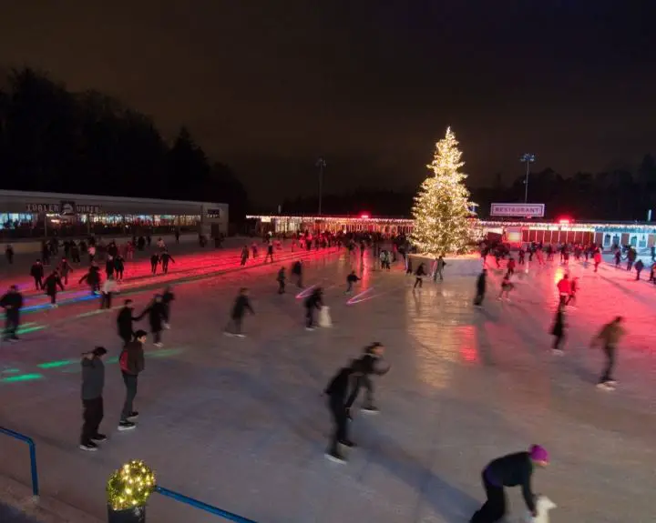Here are three of our favorite places to ice skate in Zürich are the Weihnachtsdorf Christmas Market, ETH, and Dolder. Skating is one of the most popular things to do in Zurich around Christmas. These are all very different places. My favorite is the Weihnachtsdorf ice rink. We skate, eat, and wander the Christmas market. It’s a one-stop-shop for all things Christmas. ETH is the very best view of Zürich. It’s located at the university, up on the hill, so we can see all the rooftops of Zürich. And the snack bar there is really cute. Dolder is a large and very well laid out facility with enough room to skate as well as lockers for all your stuff.